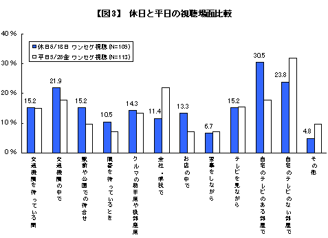 視聴場面をみると、平日よりも休日は「交通機関の中で」「駅前や公園での待ち合わせ」「クルマの助手席や後部座席で」「お店の中で」「順番を待っているとき」など外出先や移動途上の様々なシーンで視聴機会が増えていることがわかった。自宅では休日・平日に限らずよく利用されているが、平日が「自宅のテレビのない部屋で」が多かったのに対し、6月18日は「自宅のテレビのある部屋で」が多くなっている。【図3】