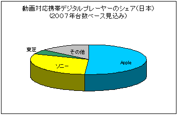 携帯デジタルプレーヤーのシェアは日本/世界ともにAppleが他を圧倒しており、ともに市場の半分以上を占めている。日本市場ではソニーが3位以下を大きく引き離して30%近くのシェアを確保し、Appleとソニーで約80%を占める2強体制となった。東芝がgigabeatのワンセグ対応などで3位となったが、従来の専業メーカーや、参入・再参入してきたAVメーカーは「その他」の中に埋没してしまった。この状況は動画対応携帯デジタルプレーヤーのシェアでもほぼ変わらない状況である。