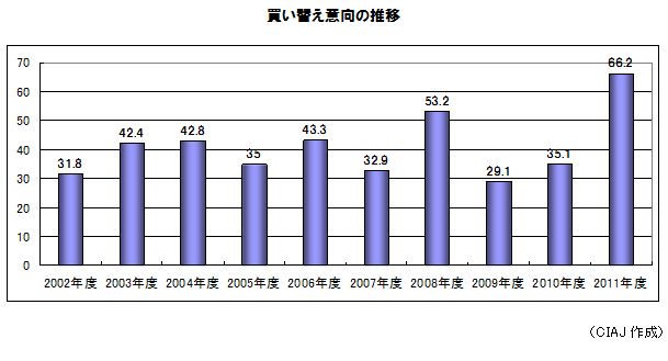 - 全体の66.2%が、現在の機種の買い替え意向あり。前年度比31ポイントもの上昇であり、今後市場が活性化することが予測される。