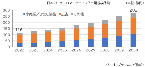 - 日本のニューロマーケティング市場は、2022 年で116 億円と推計され、2030 年には282 億円になると予測。
